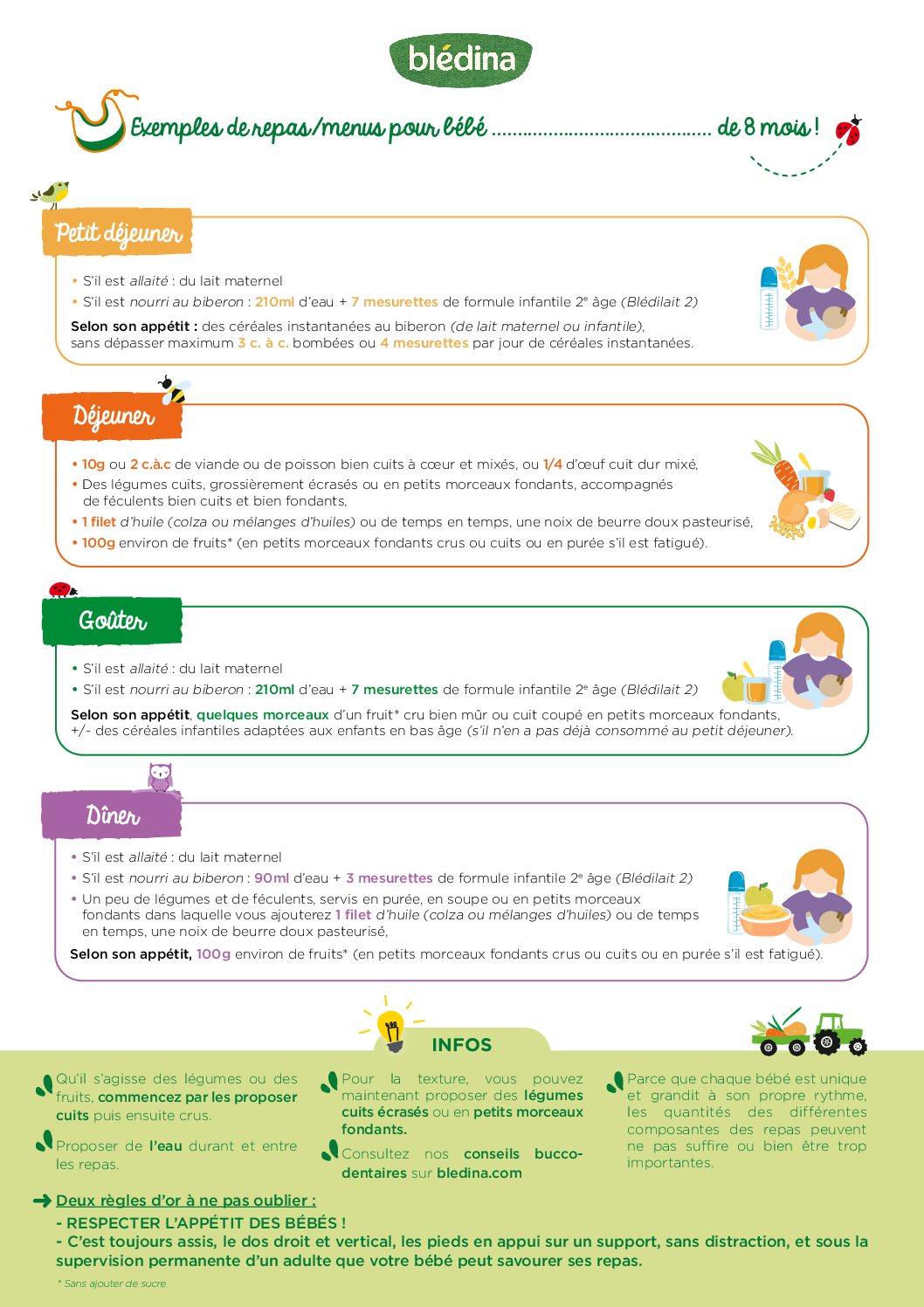 Ou un biberon composé de 210 ml d’eau + 7 mesurettes de lait infantile 2ème âge (Blédilait 2) avec éventuellement des céréales infantiles adaptées aux enfants en bas âge s’il n’en a pas consommé au petit déjeuner.